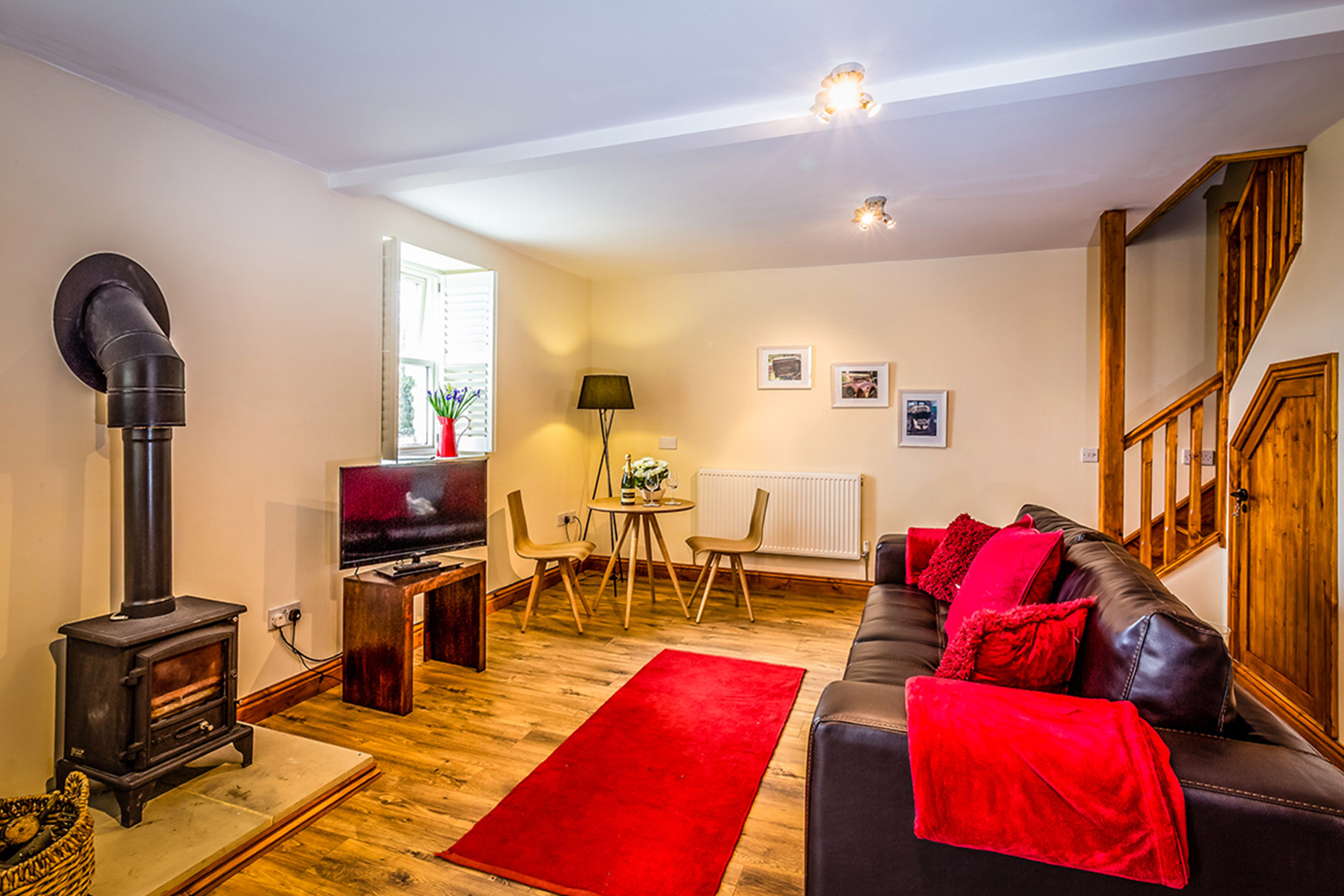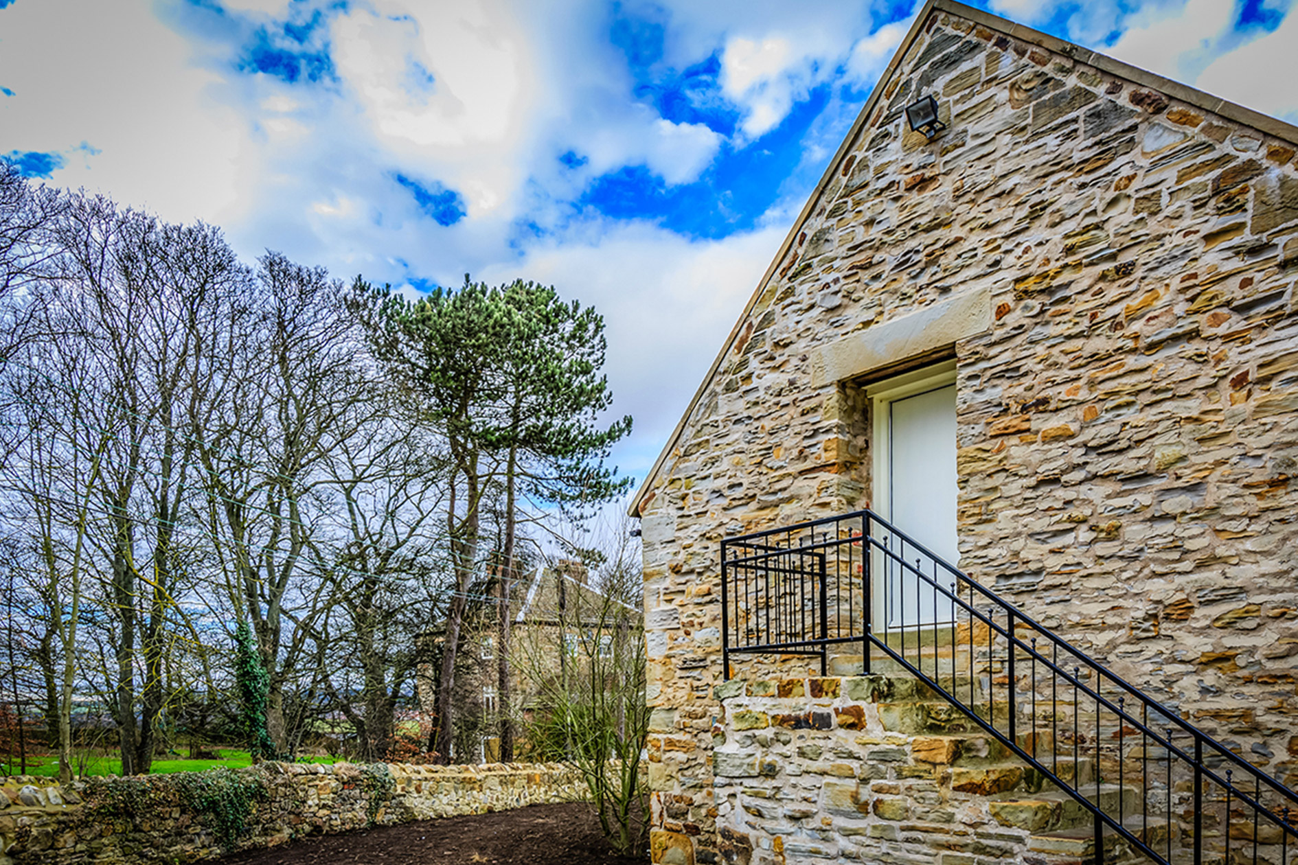 The exterior of this 500 year barn, which had been unused for many years, was painstakingly restored in Summer 2014 with the original stone repointed with lime mortar, and where necessary replaced by old stone from the site. The original stone stairway to access the first floor has been retained, though you’ll be happy to know a new internal staircase was added with the cottage entrance now hidden away around the other side of the building. – (Restoration by Bayhaven Ltd – thanks to Kev, Mick & Dave for their skill & patience)