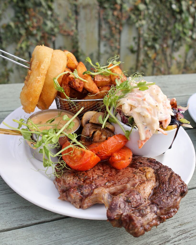 Served with homemade chips, tomatoes, mushrooms, salad and onion rings.
